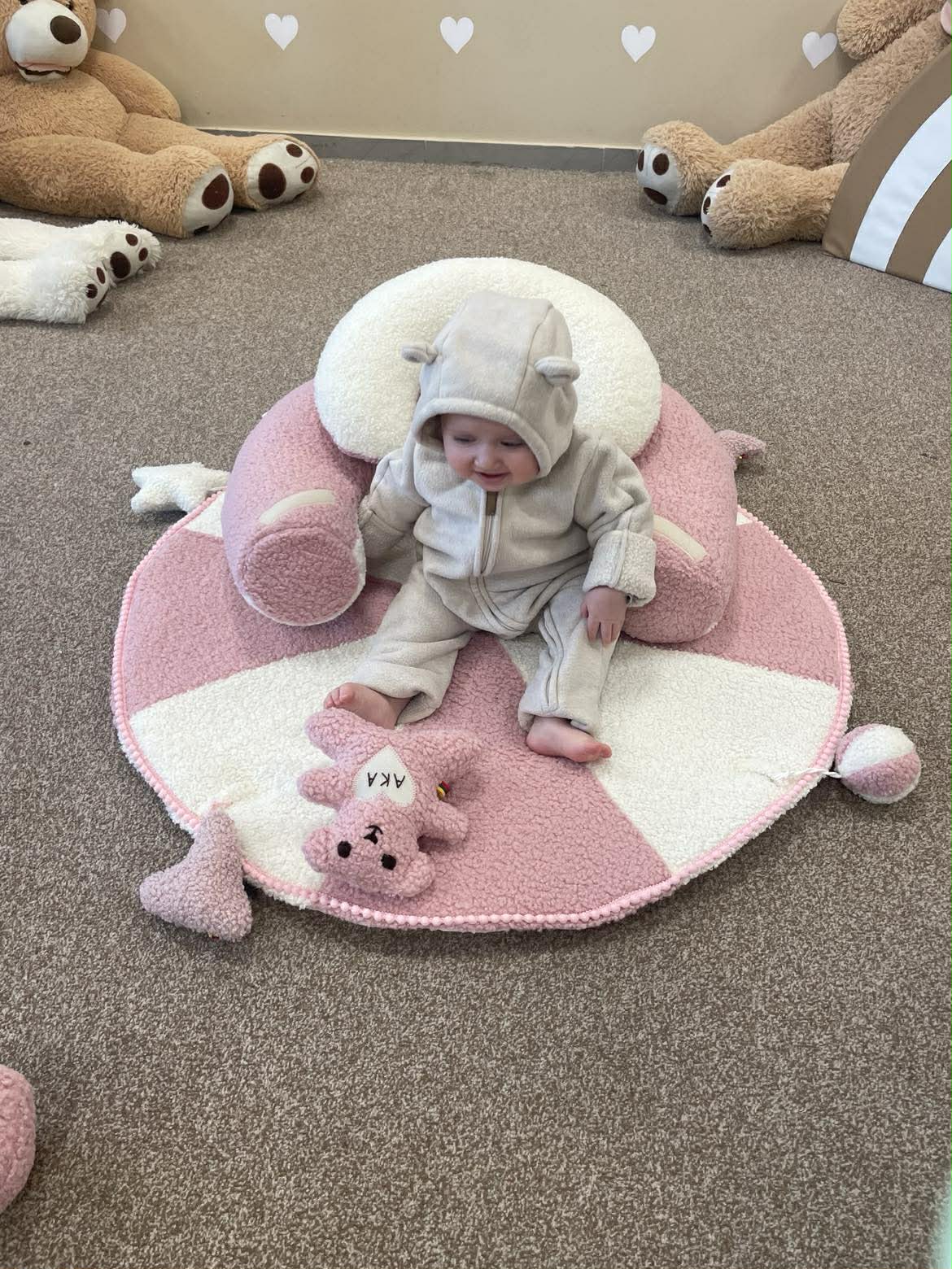 Sėdinukas kūdikiams su kilimėliu 90 cm ir 4 rankų darbo žaisliukais – rankų darbo dovana | Teddy rududu žaidžia