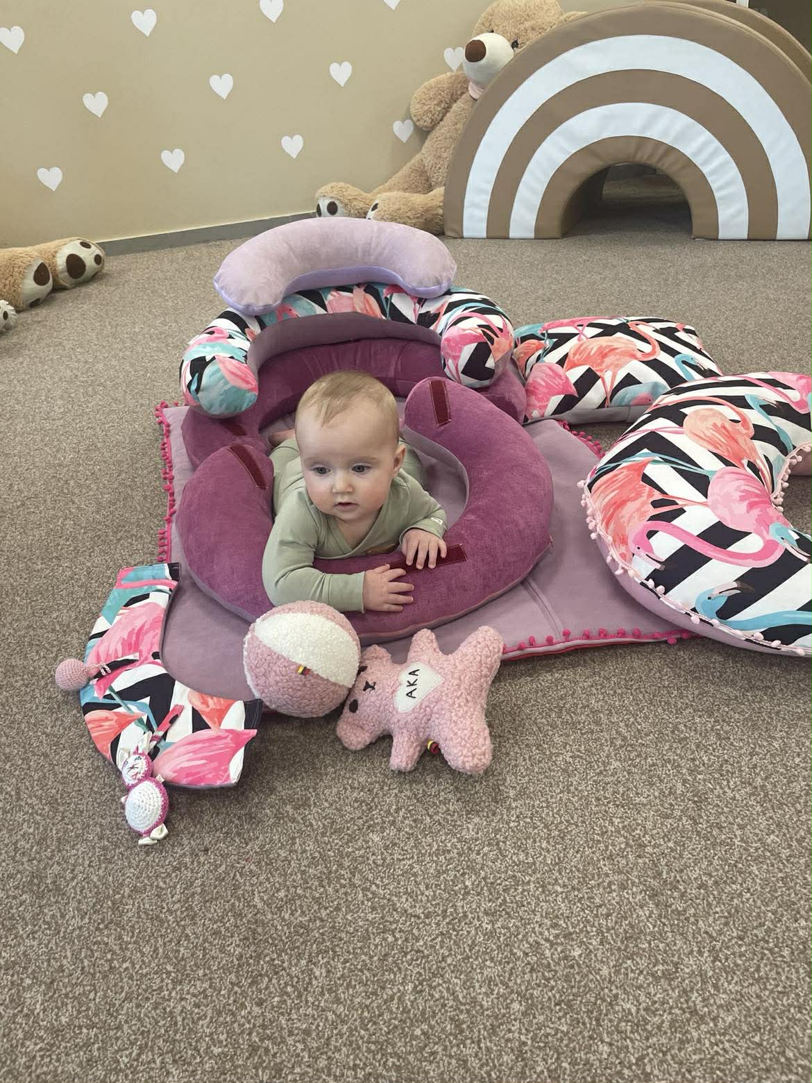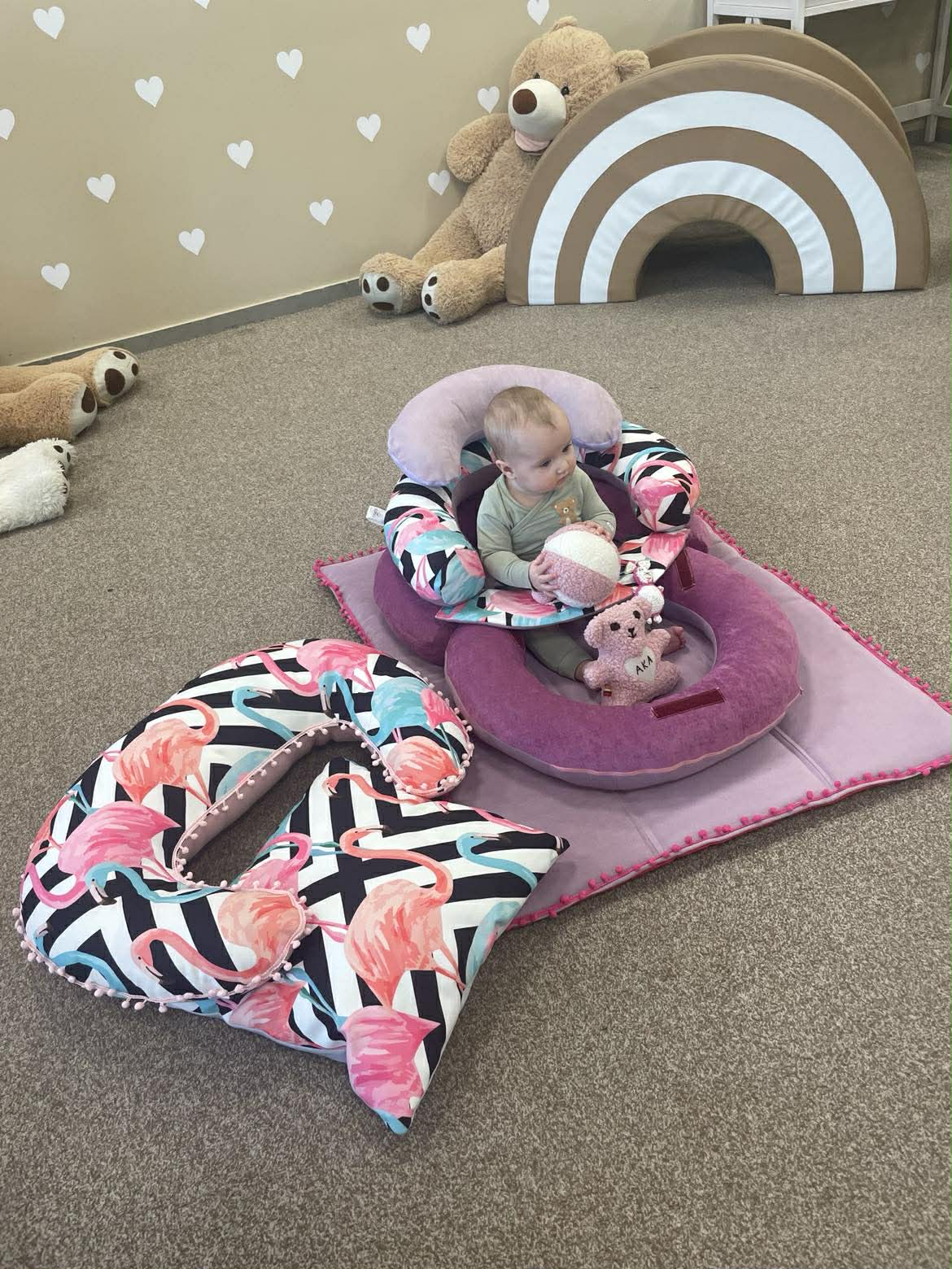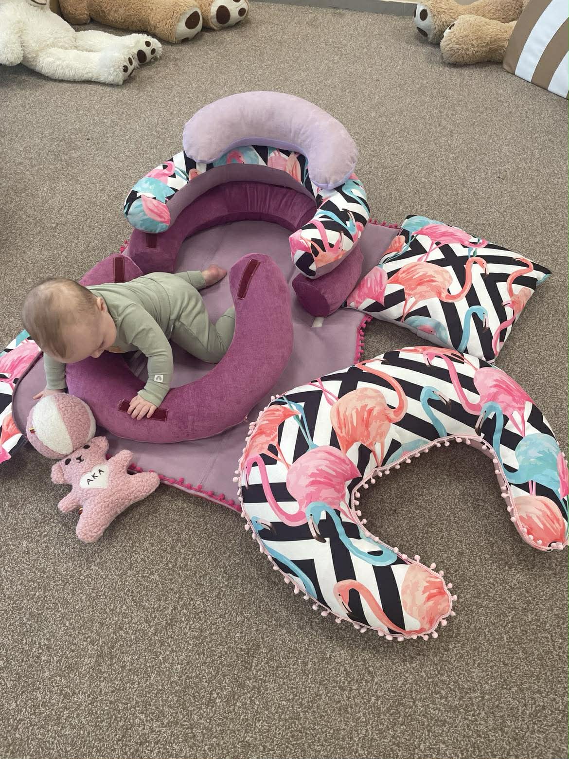 Sėdinukas kūdikiams „Transformeris“ su kilimėliu 95×75 cm, maitinimo pagalve ir miego pagalve – rankų darbo dovana | Flamingai
